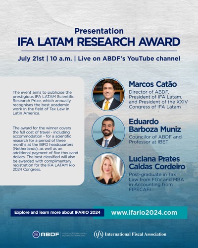 The award for the winner covers the full cost of travel - including accommodation - for a scientific research for a period of three months at the IBFD headquarters (Netherlands), as well as an additional payment of five thousand dollars. The best classified will also be awarded with complimentary registration for the IFA LATAM Rio 2024 Congress.